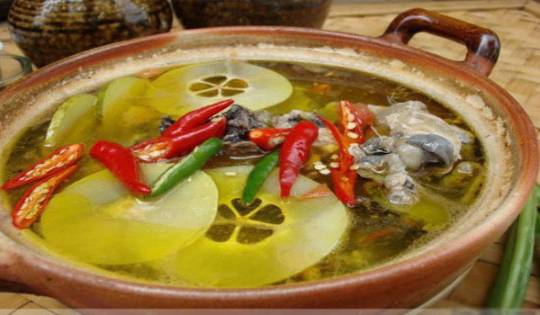 因此,大理州云龍縣一帶,用其盛產(chǎn)的酸香可口的木瓜燒雞來防病治病補(bǔ)身,也用來招待遠(yuǎn)方來客,為客人消疲解乏,強(qiáng)筋健胃。木瓜雞所用之雞,必以1500克左右的仔雞為主料,宰殺腿毛清洗干凈后,斬為小塊,放入燒熱的香油鍋里翻炒后,加鹽放水煮至七成熟時,加入削皮切絲的木瓜繼續(xù)燒至雞肉酥嫩,再加入胡椒粉、草果粉即成。木瓜雞,湯、肉酸香,味清純,毫無油膩之感,食后令你胃口大開,通體舒坦。